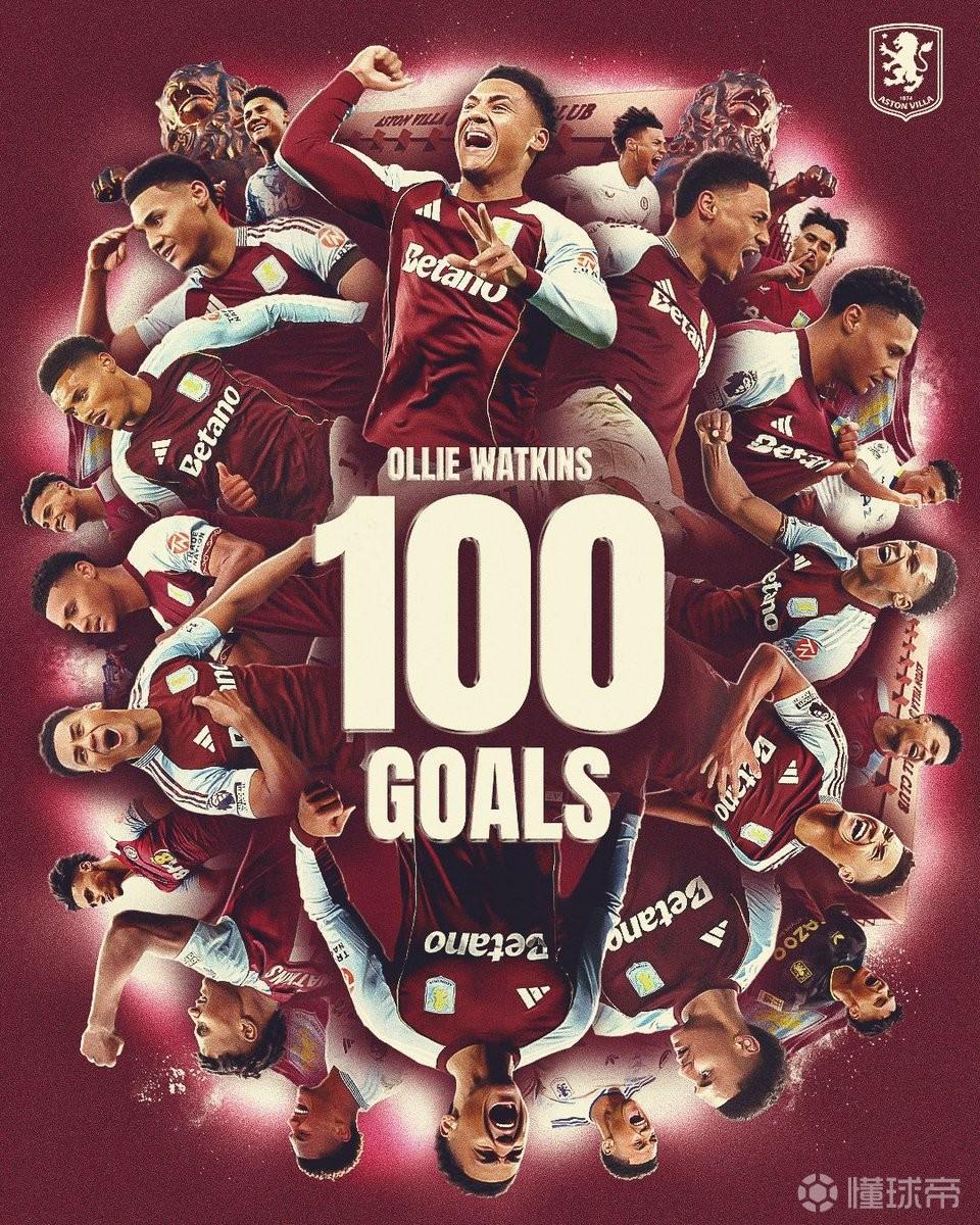 据统计,这是沃特金斯维拉生涯各项赛事第269次出场打入的第100粒进球。