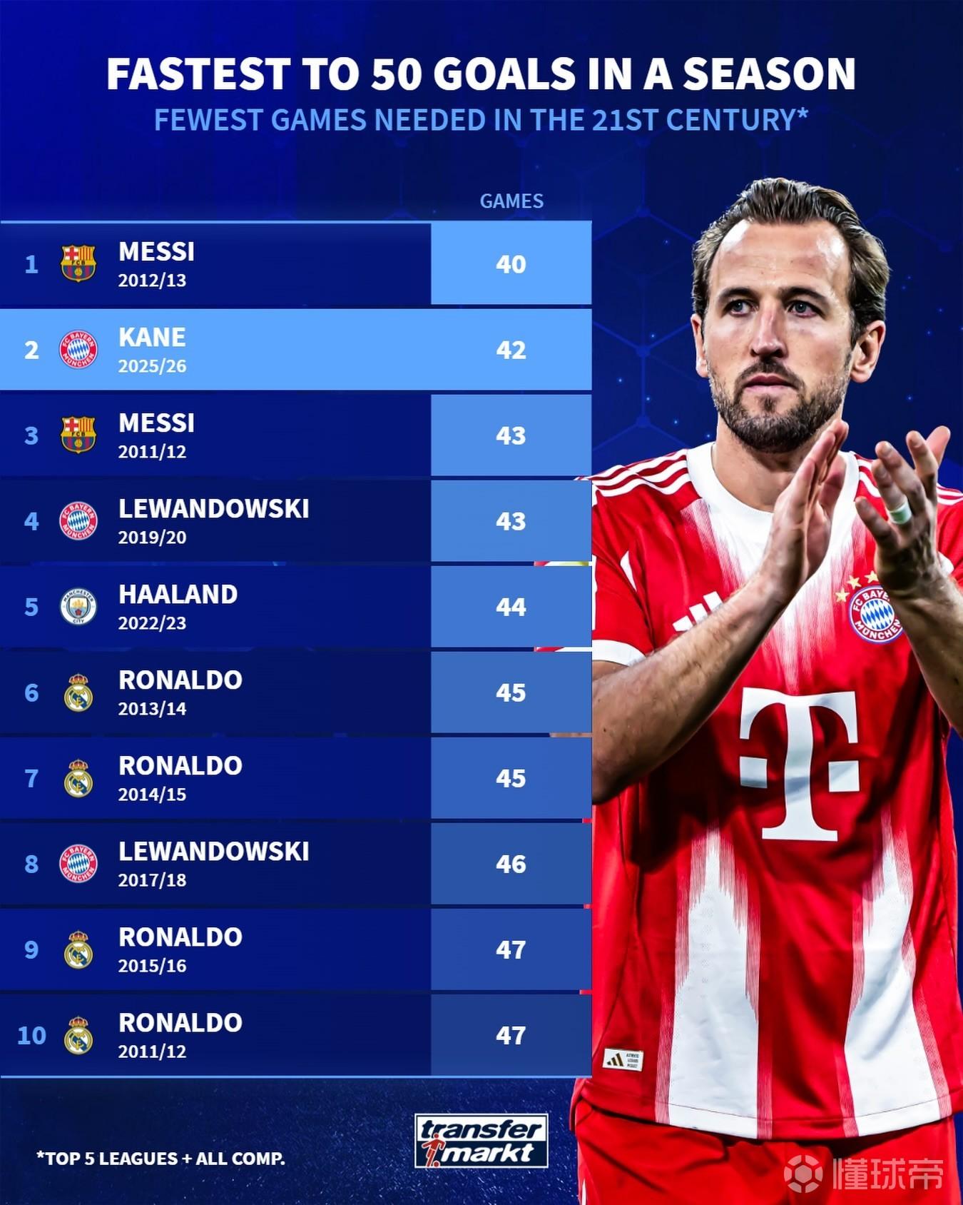 凯恩赛季50球仅用42场,本世纪五大联赛球员仅次于梅西